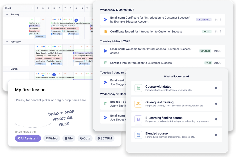 Whether you deliver in-person workshops, online sessions, blended courses, or self-paced learning - Cademy keeps your operations, learners, and progress data in perfect sync.