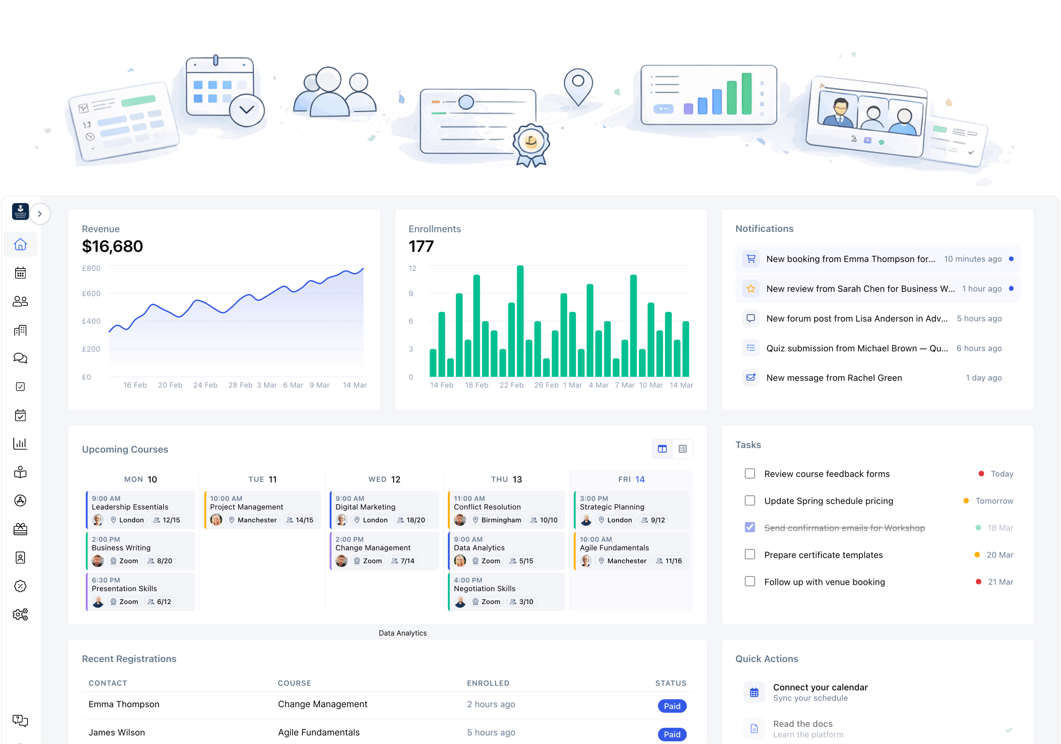 Scheduling, deliveries, certifications, enrolments, and admin - fully connected.