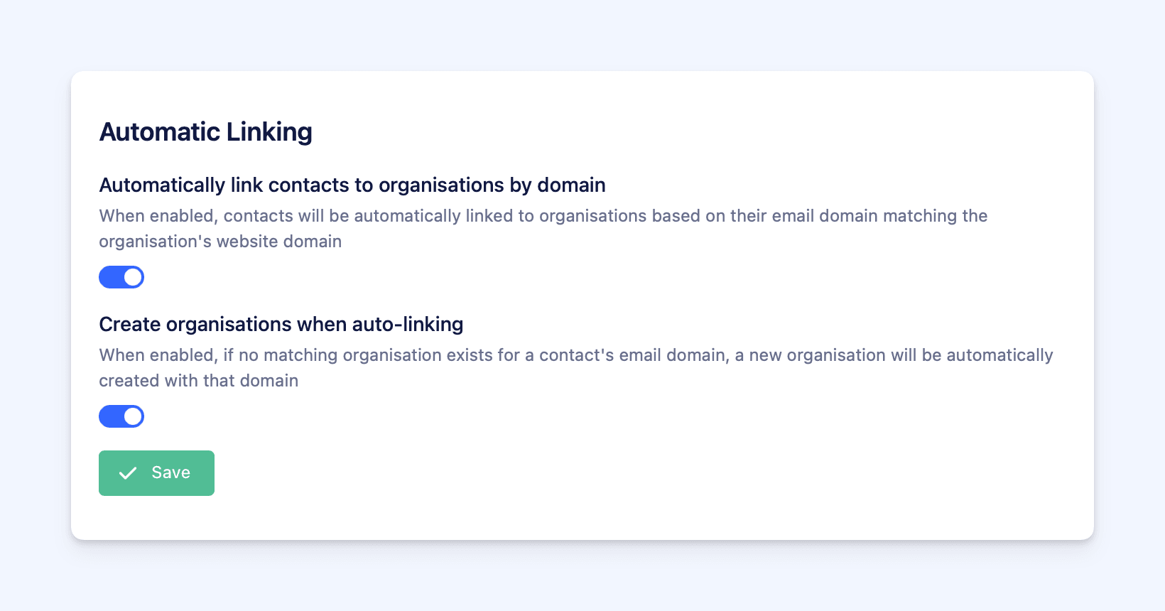 Automatic linking is disabled for all accounts until you choose to turn it on. When enabled, new or updated contacts will be linked automatically based on email domain. This applies only to future changes and new contacts and it does not update your existing contacts. If you want existing contacts linked, you will need to import organisations first, then review or update records as needed.