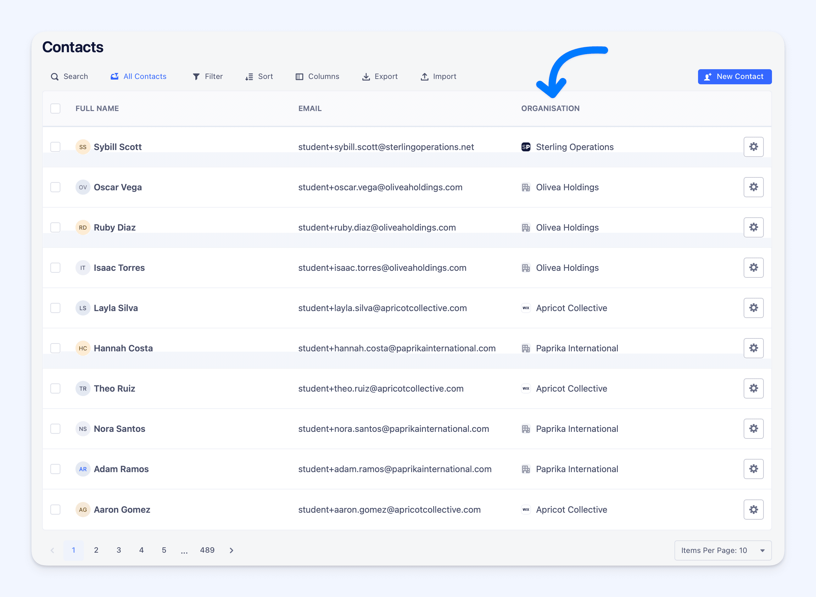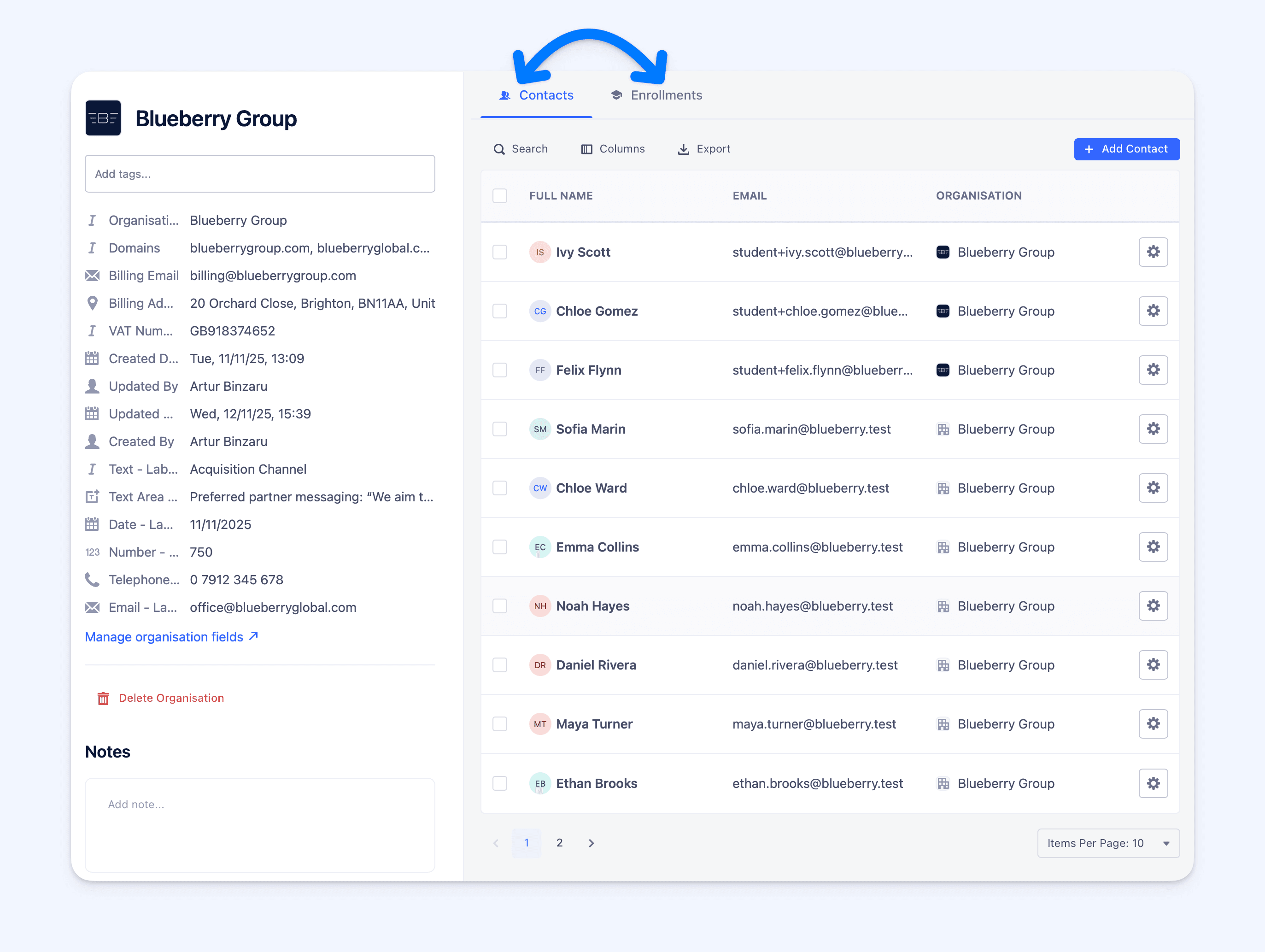 You can display the organisation field in Contacts and Enrollments, filter by it, and move between linked records. This makes it easier to understand which clients your learners belong to and track activity across teams or departments.