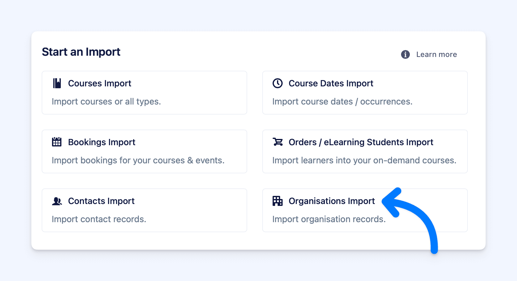Visit the Organisations page in your admin dashboard to create your first organisation or import your existing companies in bulk.