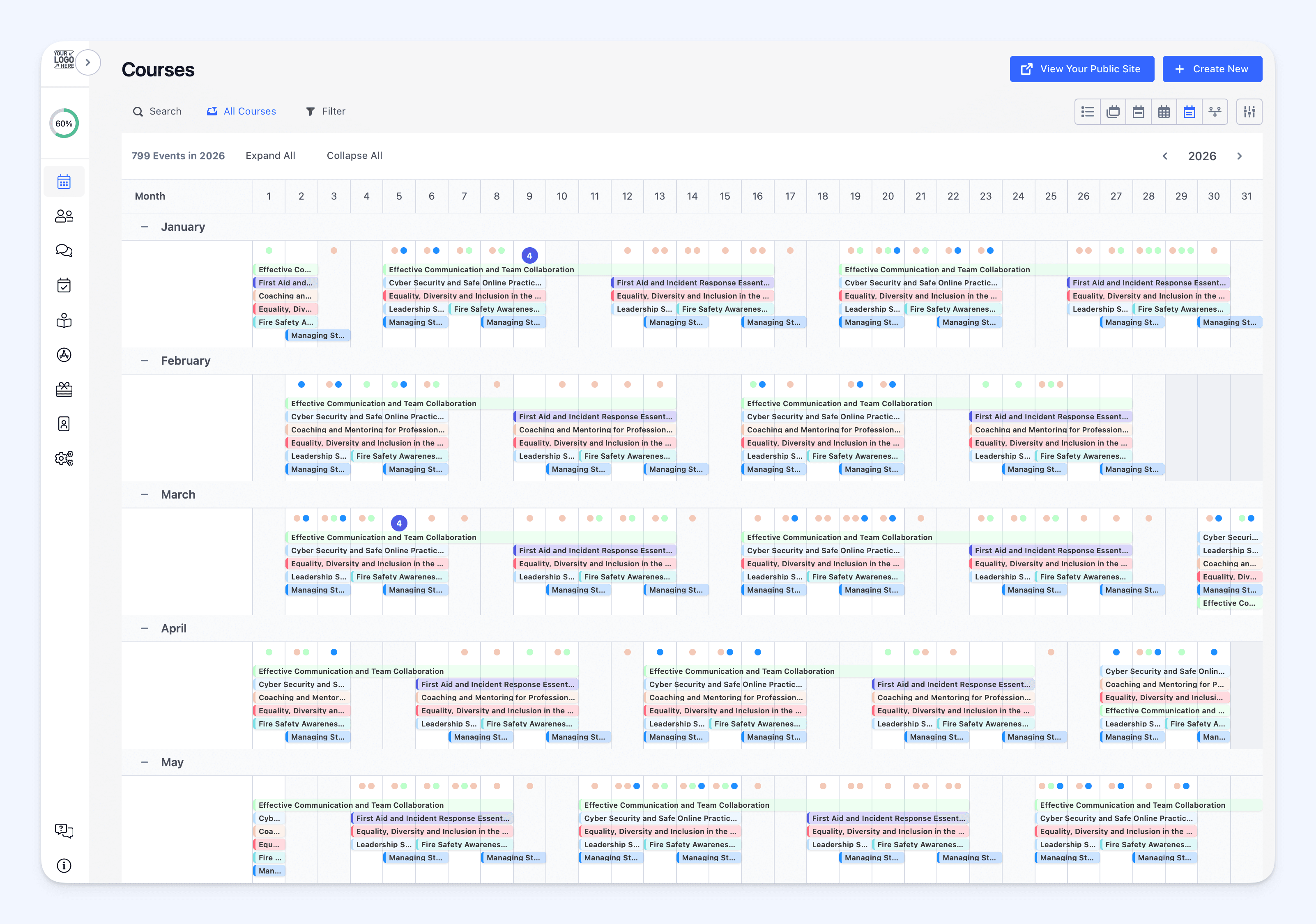 You can now switch to Year View in the Courses dashboard to see every session across all twelve months in one clear, scrollable layout.