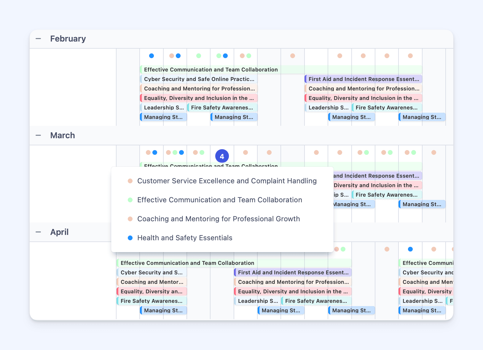 Longer courses or multi-day sessions appear as extended highlighted bars, while single-day sessions show as neat dots on the calendar. When multiple events occur on the same day, they’re grouped automatically, helping you gauge your schedule density instantly.