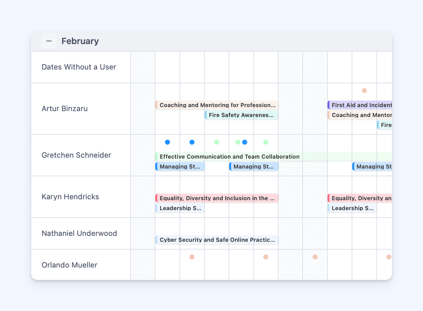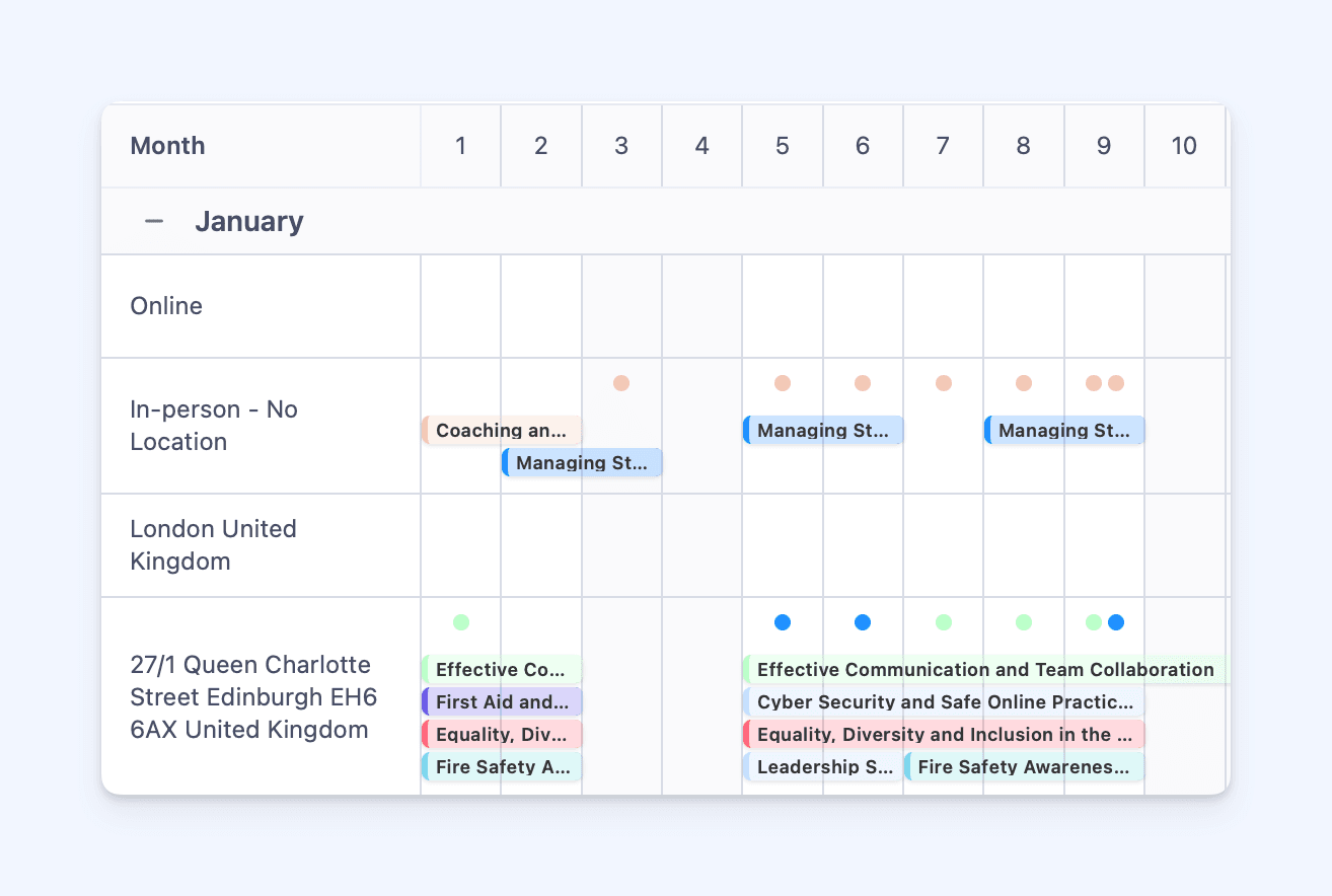 Toggle grouping to view sessions by facilitator or team, making it easy to check who’s delivering which sessions and balance workloads across your instructors.