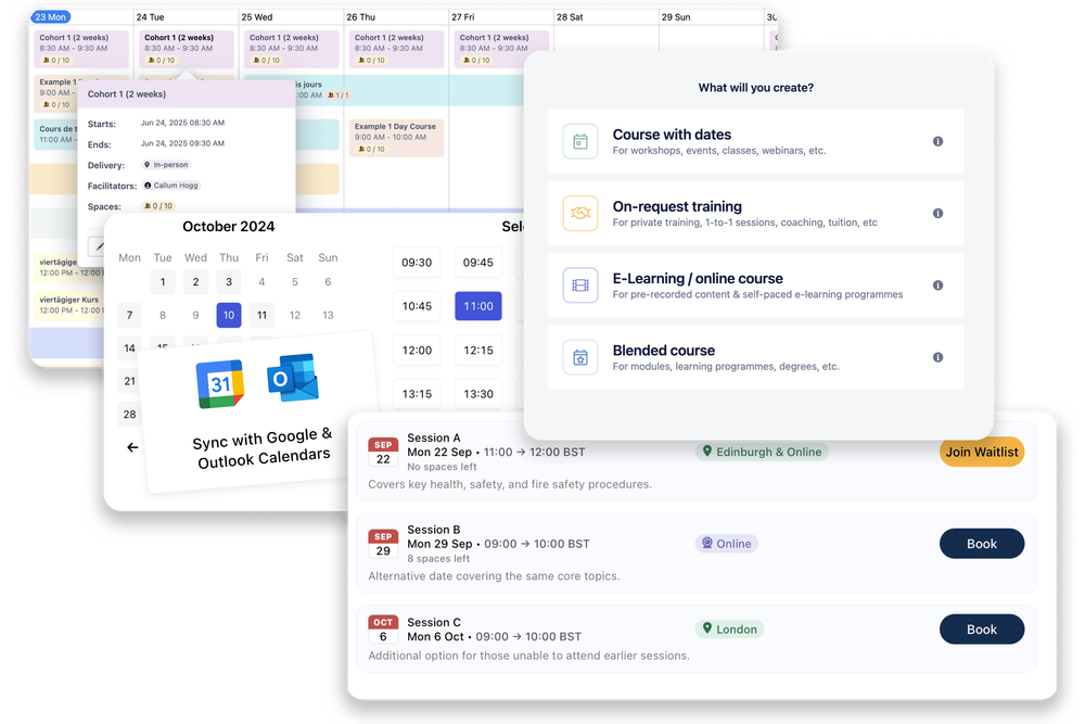 Simple, flexible bookings for online, in-person, and blended delivery.