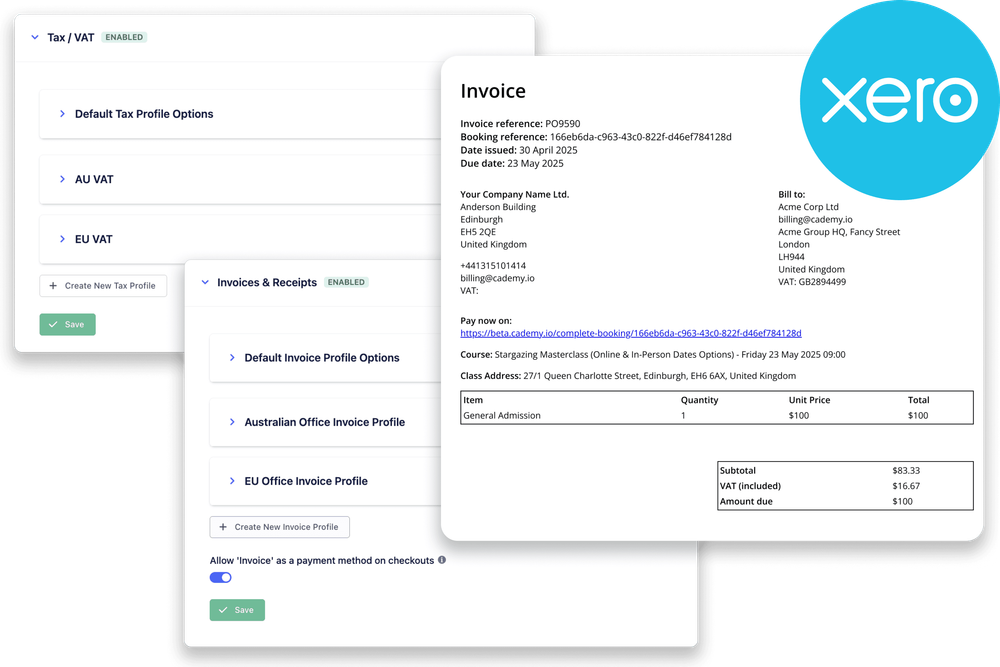 Simplify global training with automatic tax handling, location-specific presets, and multiple Stripe and Xero accounts.