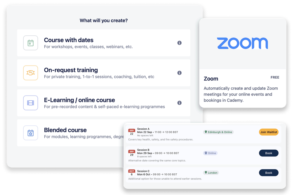 Create, deliver, and manage learning without jumping between tabs. Host live sessions on Zoom, import SCORM courses for compliance, or design interactive quizzes directly in Cademy.