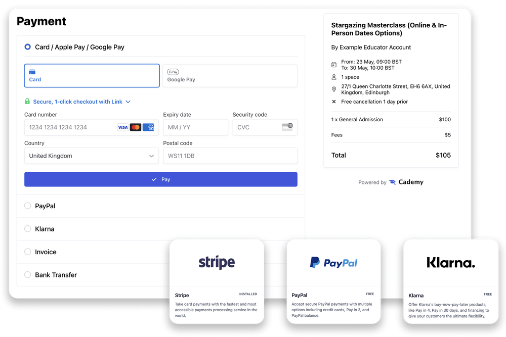 Cademy connects with Stripe, PayPal, and Klarna for fast, flexible transactions across regions and currencies.
