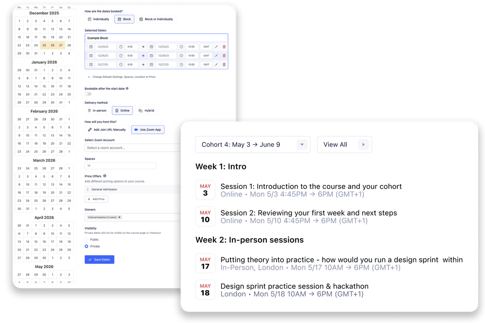 Sessions, attendance, and progress sync instantly across the learner portal and instructor calendars.