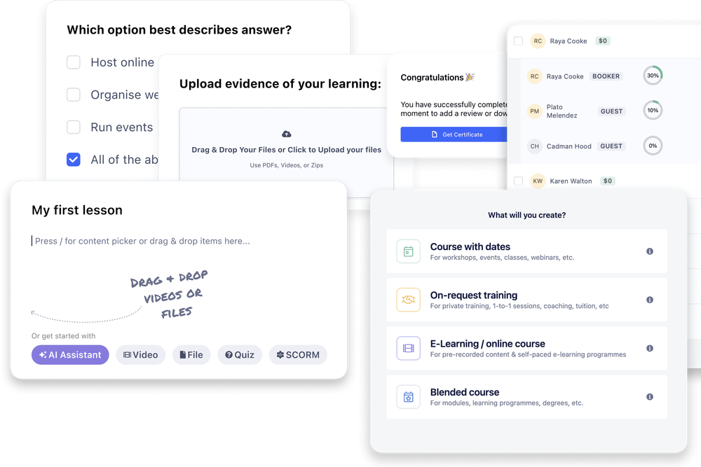 Create structured courses with AI or your own material. Upload files, embed media, add quizzes, and organise lessons easily. Zero setup required.