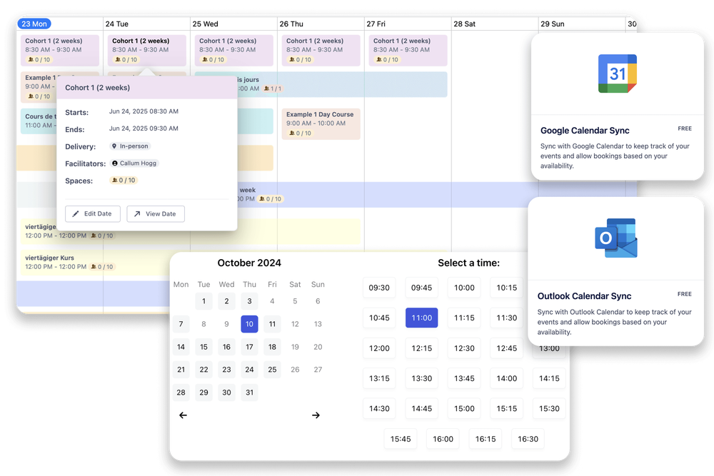 List courses with variants, dates, formats, and capacities. Take payments, apply discounts, and embed listings — all without plugins.