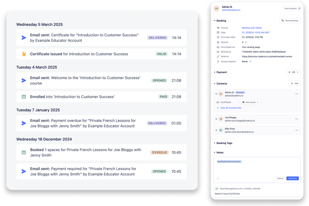 Store bookings, progress, certificates, and communication in one CRM. Nothing slips through the cracks and nothing goes out of sync.
