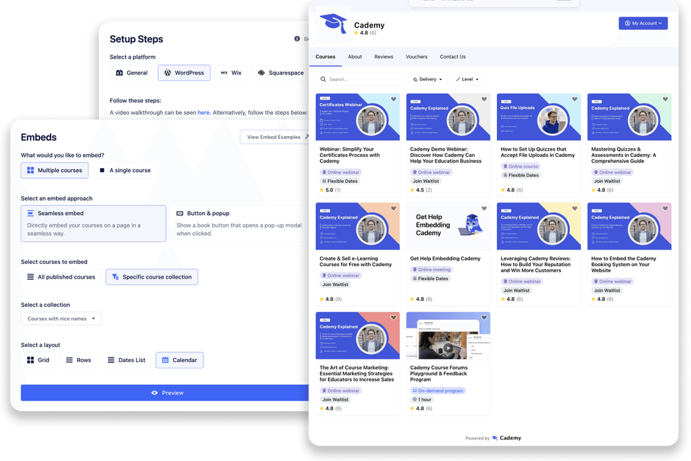 Embed your course listings and checkout flow directly on your website — or host everything within your branded Cademy portal.
