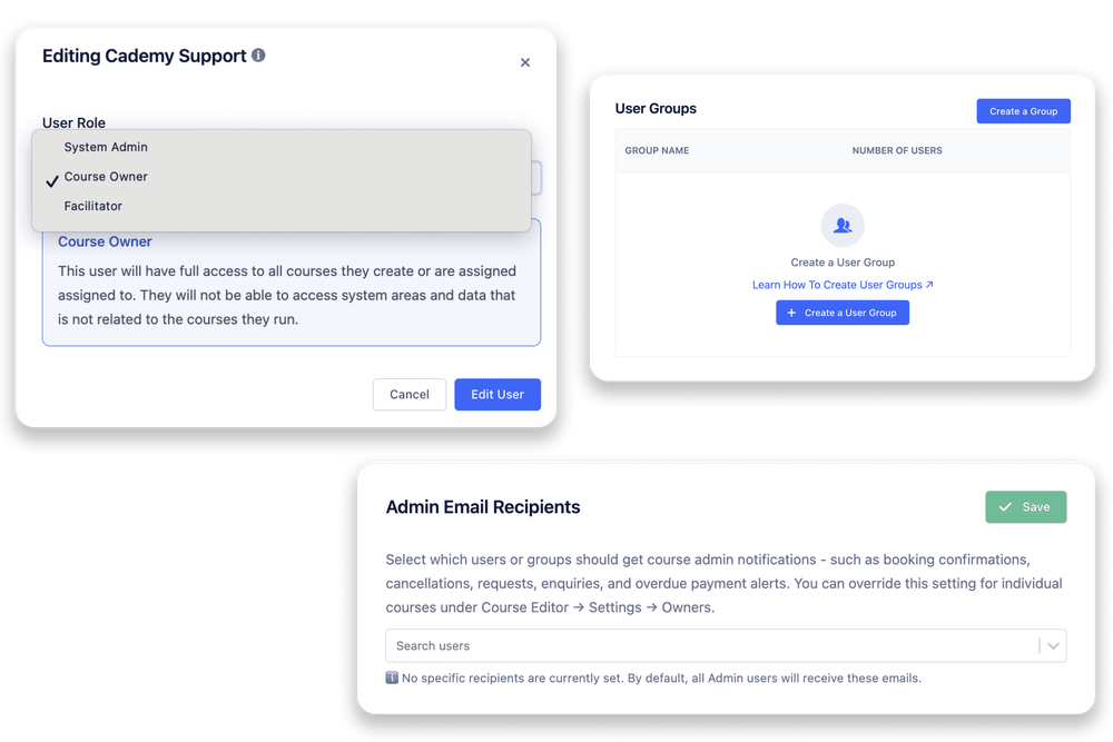Whether you run workshops, qualifications, CPD, coaching programmes, community learning, blended courses, or multi-day events — Cademy gives you everything you need to operate smoothly.