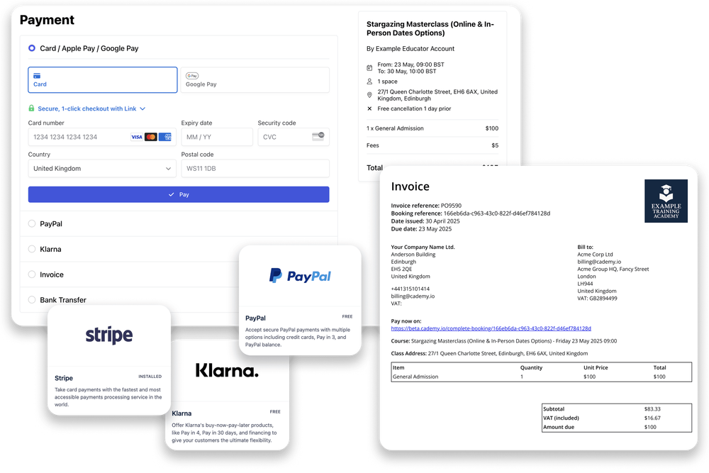 Cademy brings bookings, delivery, CRM, and payments into a single modern platform — supporting online, in-person, on-demand and blended training.