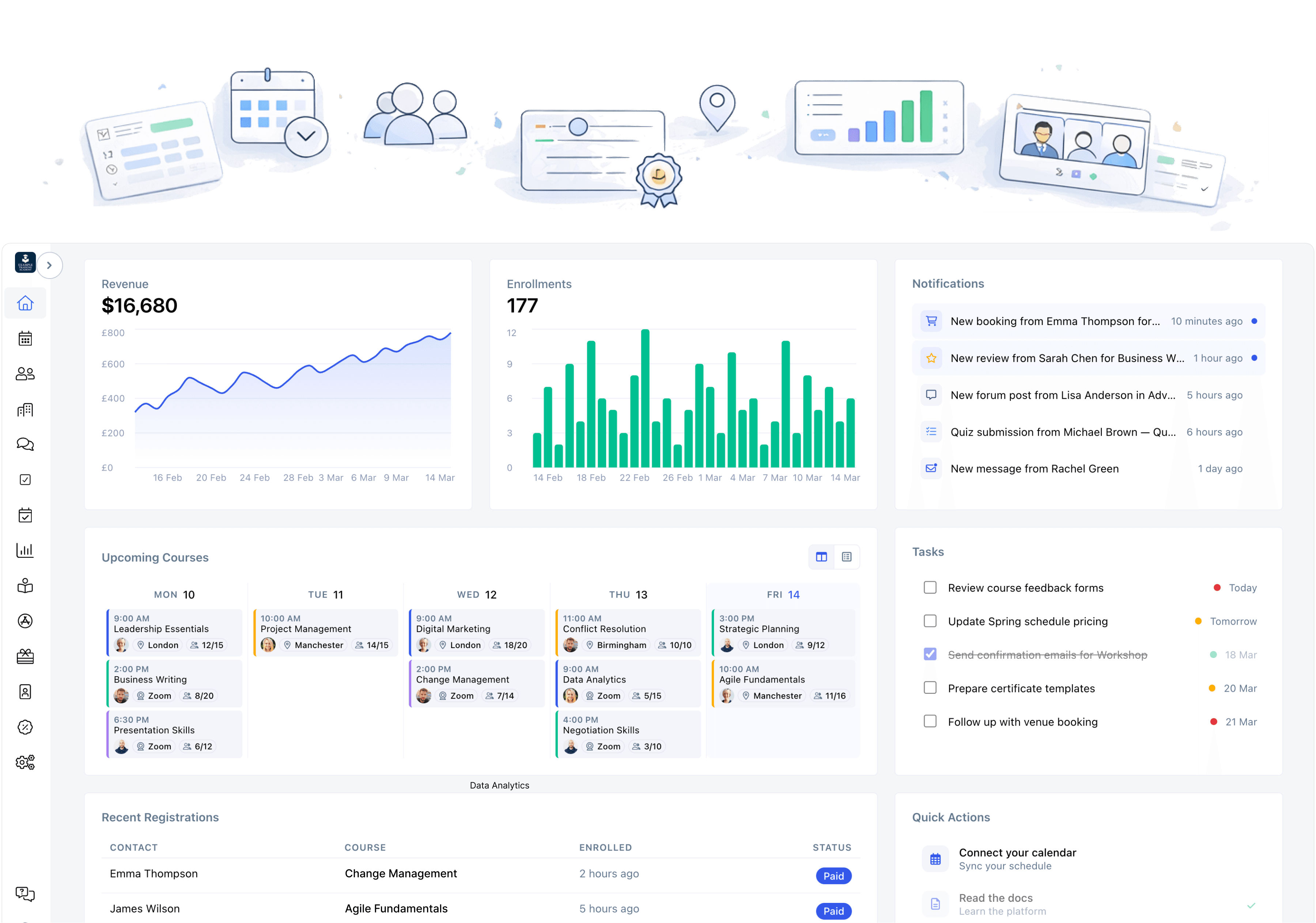 Short courses, vocational programmes, lifelong learning, and hybrid delivery - supported by clear scheduling, tracking, and reporting.