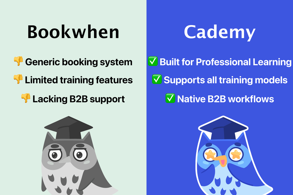Bookwhen handles bookings — Cademy delivers the whole learning journey: online modules, blended programmes, certificates, renewals, and progress tracking.