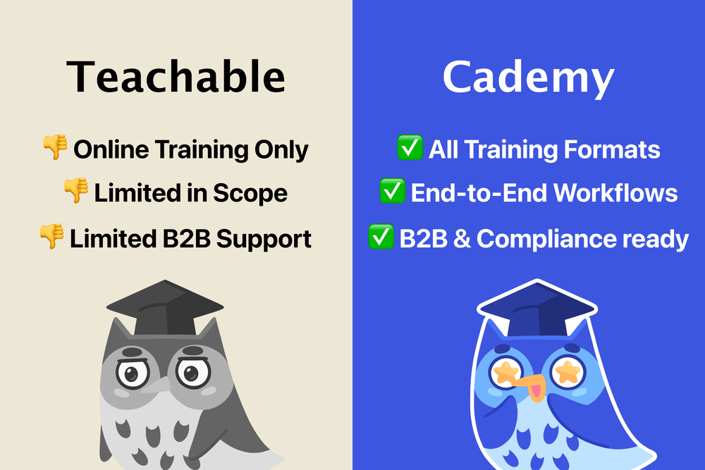 Teachable is built for selling self-paced content. Cademy supports online, in-person, blended, and multi-day training with scheduling, attendance, and instructor management included.